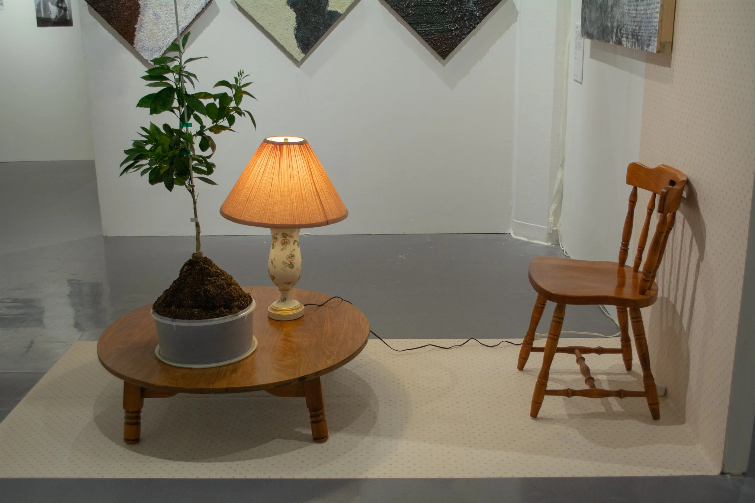 "Propagation: Navel Oranges," 2022, Vinyl, table, lamp, plastic container, orange tree, antique objects, 8’ x 8’ x 4’