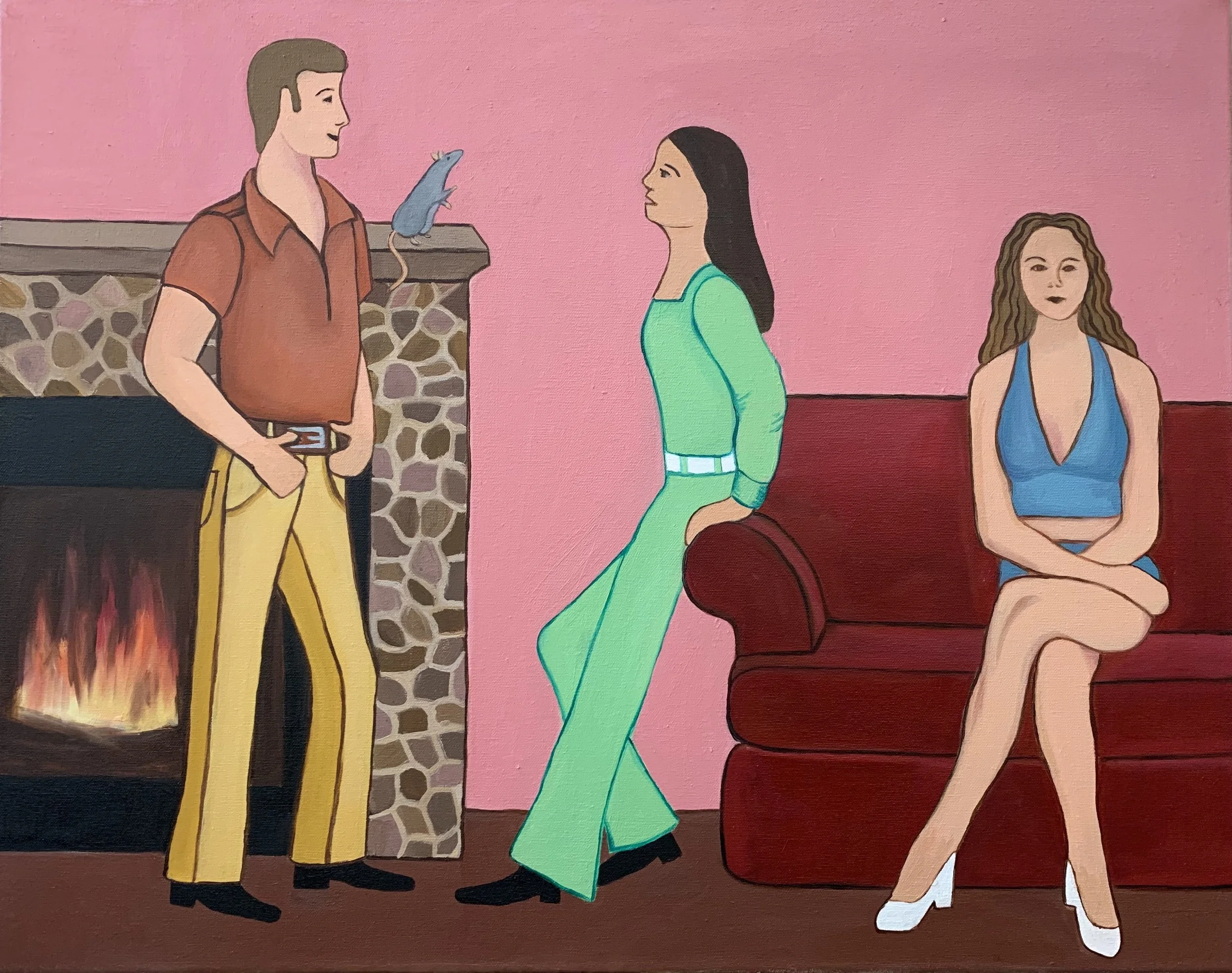 Drawing inspiration from medieval manuscript art and late 20th century fashion, I create oil paintings that bring out the humor and awkwardness of social interactions while also recognizing the earnestness of each situation. Using memories from parties, nightlife, and gatherings as the point of departure for each piece, I experiment with vibrant color palettes to create atmospheres that are flat and illustrative. By using a visual language that combines both pre-modern and contemporary aesthetics, I create worlds that challenge the viewer to find humor in dramatic situations. I draw from 1970’s fashion catalogs and vintage clothing patterns as inspiration for the wardrobes of each person. I create visual rhymes by repeating hair styles, clothing and facial expressions, infusing the paintings with a feeling of the uncanny underneath a sense of repetitious monotony.
