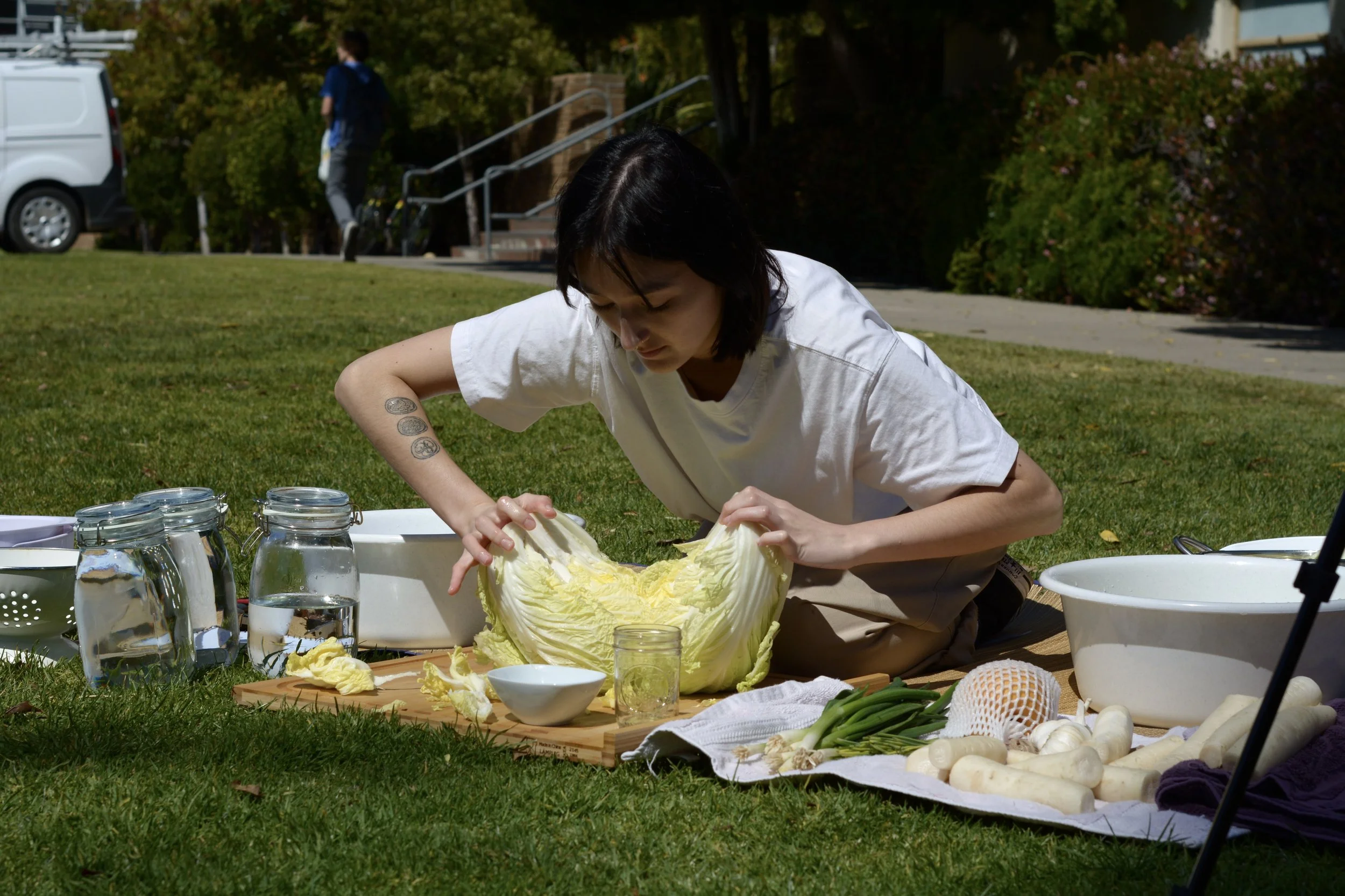 My work explores the relationship between ritual, material, and narrative through a queer, trans non-binary, mixed-race lens. I combine family artifacts and oral histories with found objects to sift through intergenerational memories. For example, by reenacting and recontextualizing the ritual of making kimchi, I queer the ritual and disrupt the gendered narrative of fermentation. Historically, fermenting kimchi is a process enacted by and preserved by generations of women; often, the knowledge of the ritual is passed down matrilineally. By inserting the queer and trans-non-binary subject in the ritual, I create space for imagined frameworks of a generational lineage that emboldens queer narrative. Queering kimchi and fermentation becomes a site for dialogue, healing, community, and softness.