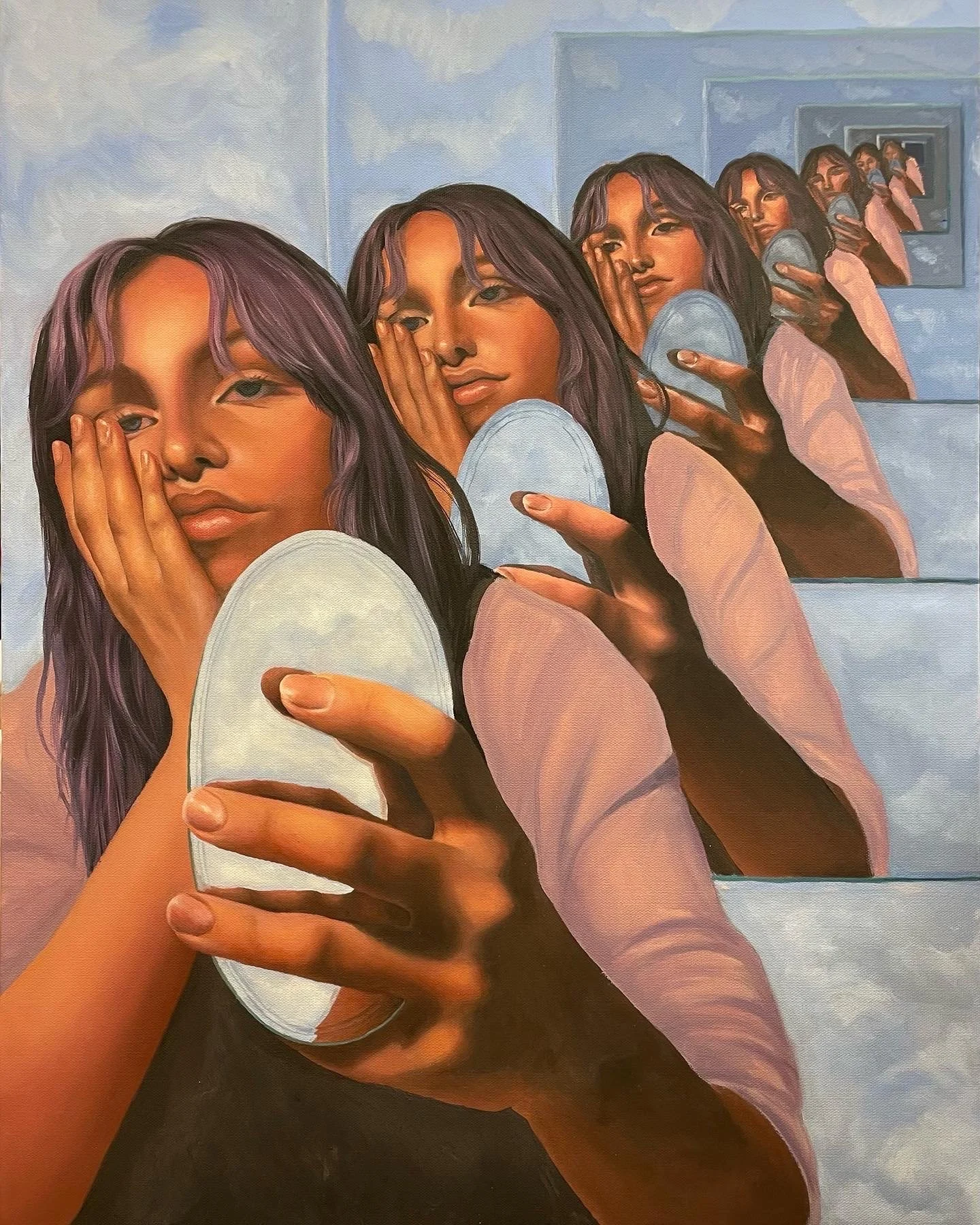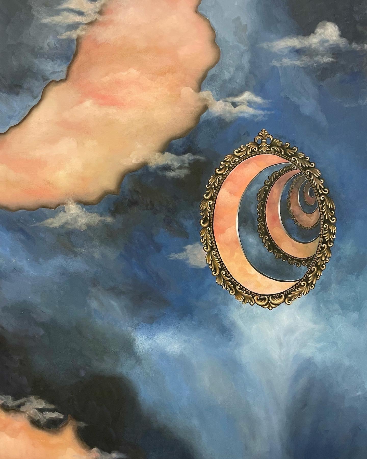 The ultimate goal of my work is to trick the eye and evoke the mind. Using traditional elements of hyperrealism and surrealism, I create illusions that perplex the sense of depth within the canvas. It is a wonderful and unusual challenge to combine flat textures and imitations of 3D textures within the same painting. The immersion of opposing dimensional plains is exactly what I am confronting with my work. The ways I have achieved this so far have been playing with textures within an unexpected composition so that space becomes unfamiliar. It all began with a painting I made in 2022. I started by creating a diorama of torn up white paper. I photographed the diorama and used that image as my reference for the painting. In between the shreds of paper, I painted in very naturalistic textures such as water and clouds, in an effort to create a scene where depth is an illusion, tricking the eye. My work strives to create visuals, completely altering the reality we see on an everyday basis. I want my audience to initially be confused by my work and simultaneously figure out that every detail was painted intentionally.