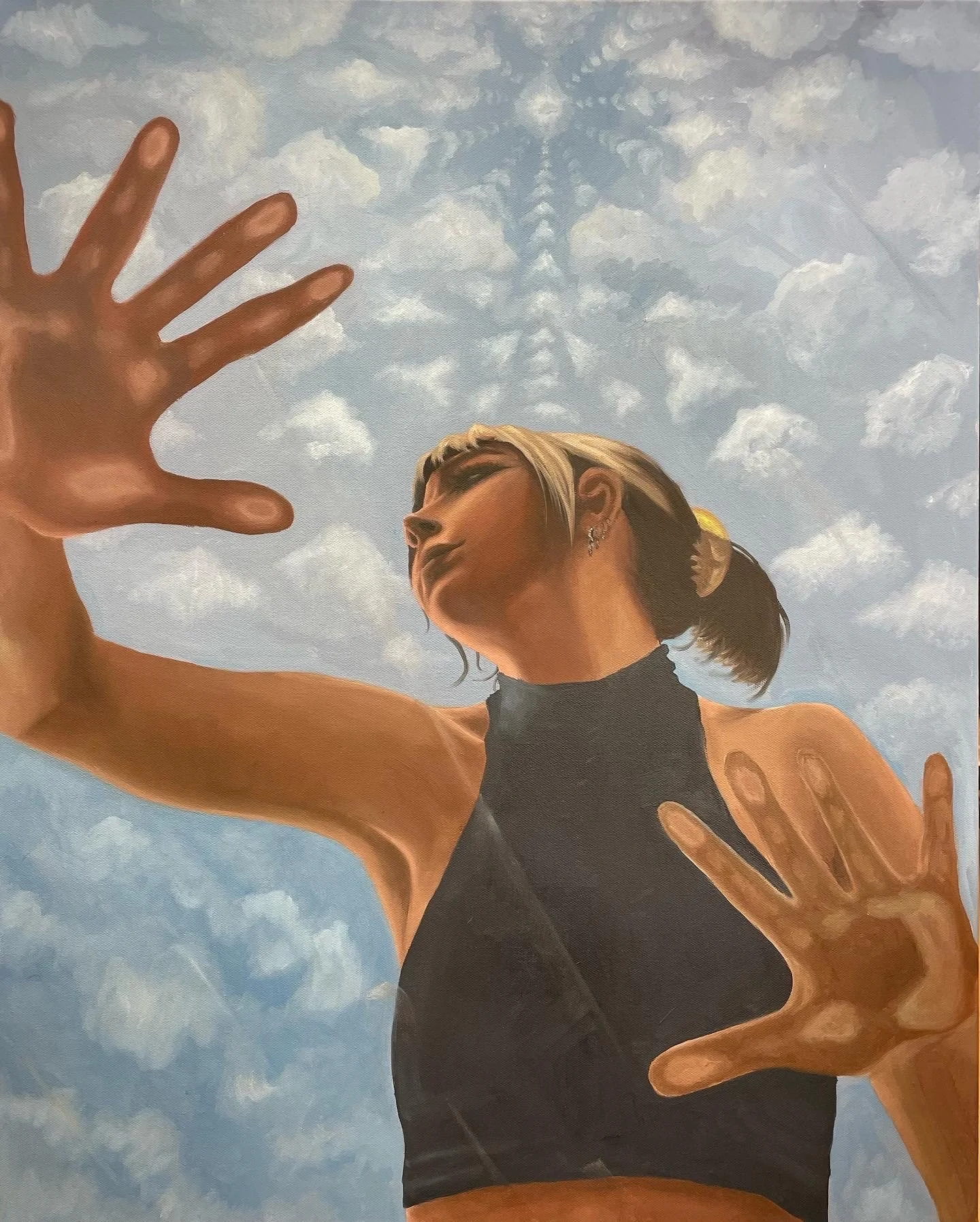 In current works I am integrating my life-long love for rendering the human form into my current theme. I am interested in combining planes that wouldn’t be seen together in the natural world within the canvas, therefore, imagining a world that is recognizable in all of my paintings. Part of what creates this perplexing, made-up world within my works is the use of hyper-realism to mimic reality so much that it tricks the eye. I created a piece in 2021 where I painted an abstract background and overlaid a realistic hand in the foreground. I painted in the shadow of the hand onto the background texture, creating an illusion of depth and trompe l'oeil. This painting brought forth questions from viewers like, “where did this arm come from?” and “what is this space or realm?” The theme of my work, no matter the subject matter, is perplexing reality and space using hyperrealism mixed with surrealism and abstraction. I want my viewers to step into the alternate world that I envisioned in my mind and brought to life in my paintings. My endeavors as an artist are to open people’s minds to view our physical existence differently than they ever have before.
