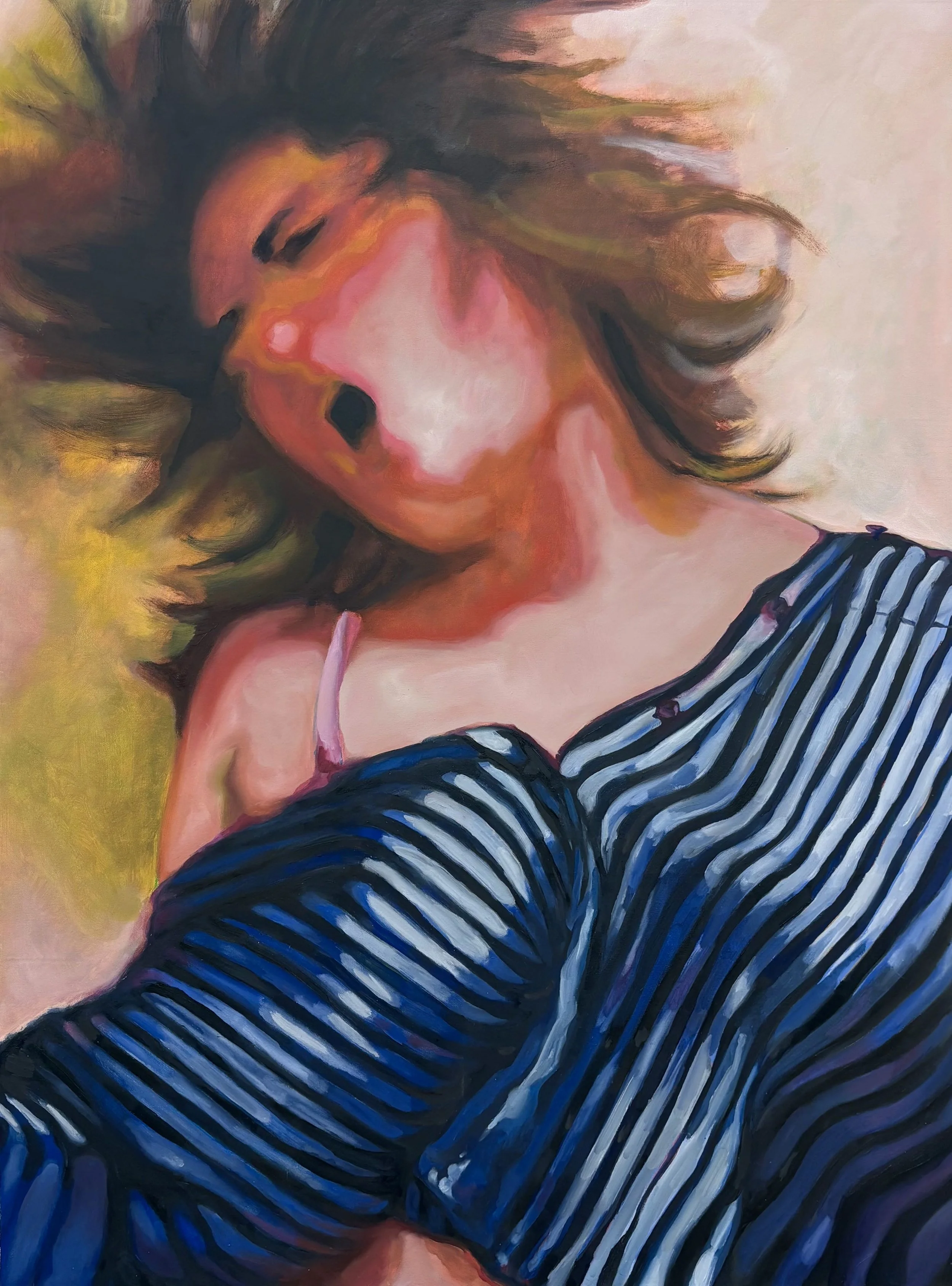 I am interested in the constructs of archetypes in popular culture. In particular, the coming of age tropes for young women such as the coquette, the manic pixie dream girl, or the damsel in distress. Deeply complex feelings get distilled down into characters that are continually repeated in our culture, creating artificial personas. Yet within these dramatic characters there are still subtle truths, characters that resonate deeply in personal and private places. What do these archetypes have to teach us about our own reality? How do they show us who we really are and how do they imprison us within the confines of their own construction? Through layering hyper-saturated color in thin scumbled layers, the archetypal figures recall a psychological “loudness” expressed in otherwise mundane imagery. The life-sized to slightly larger-than-life-sized scale of the figures draws a visual connection to the movie-imagery of pop culture, and consequently, its themes. Ultimately, the work sits at the intersection of femininity,fabricated yet truthful narrative, and psychological expression.