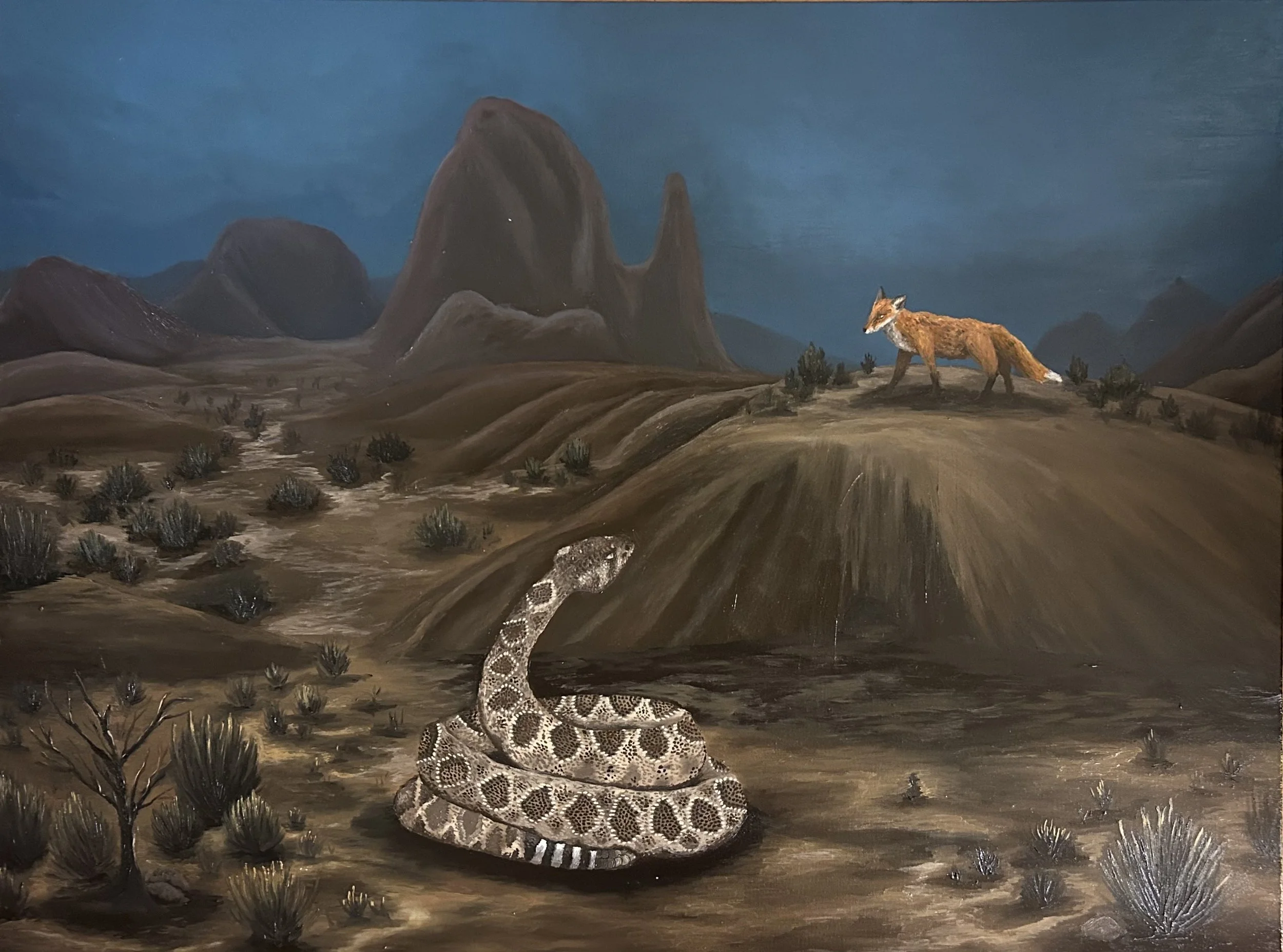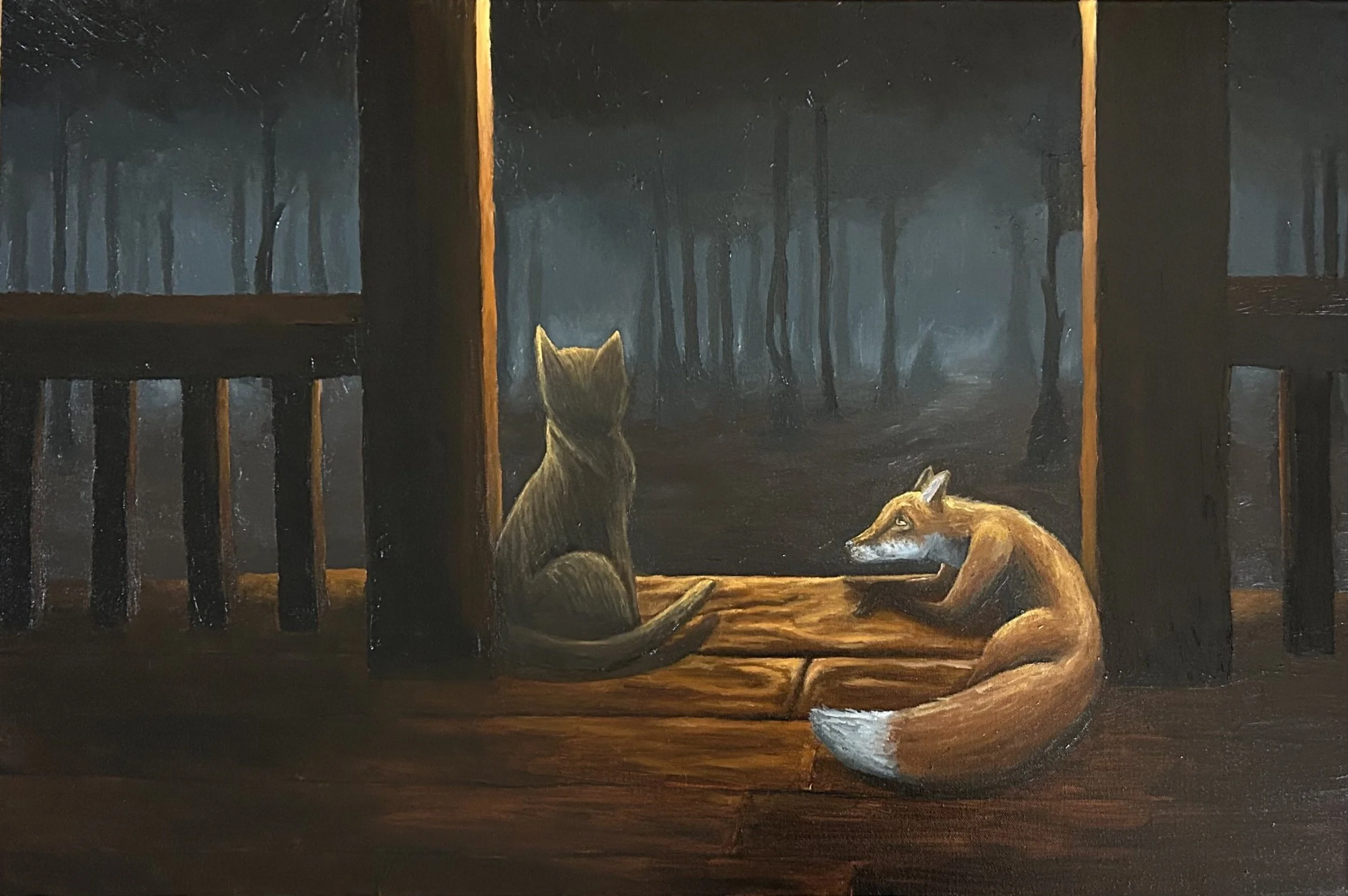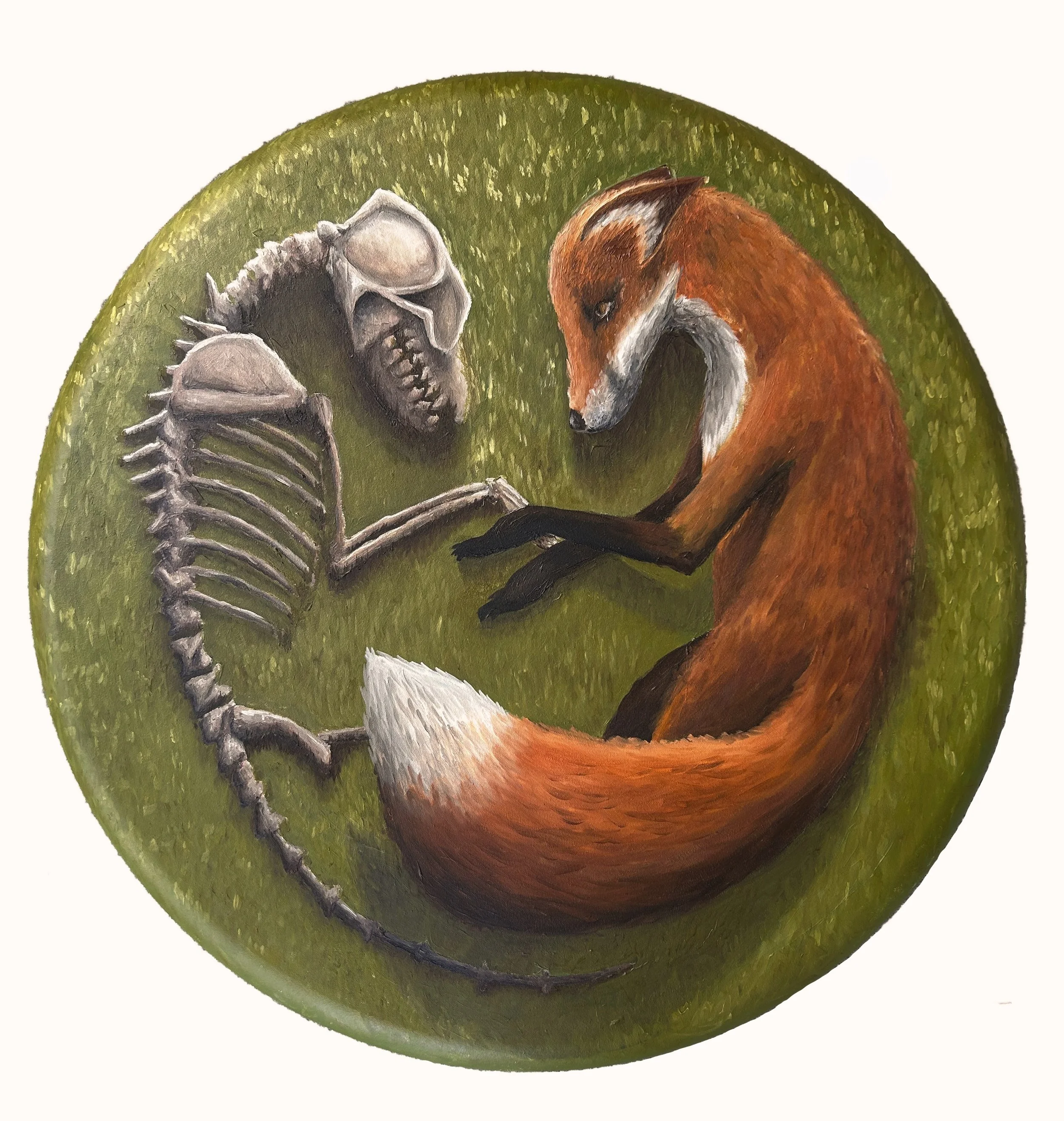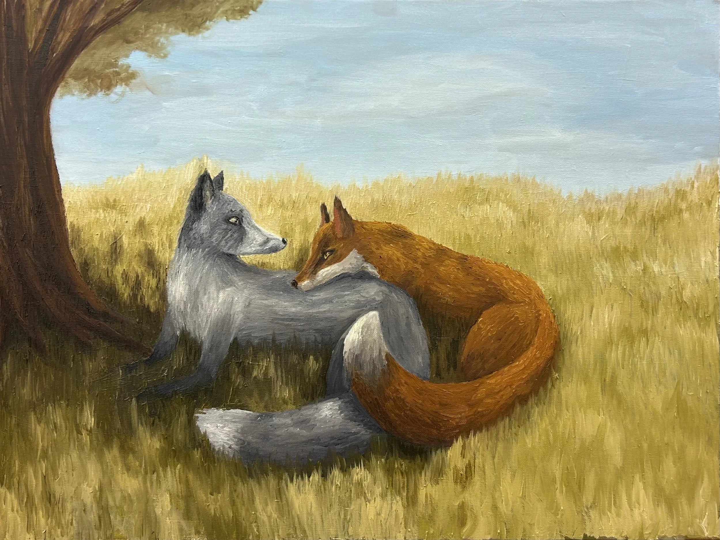 Red foxes serve as the main symbol in my work. I use the dynamics of their playfulness, protectiveness, and even hostility to create a narrative vessel for the human experience. Animals such as deer, snakes and birds often accompany this symbol, and together act out dynamic relationships that create their own mythology. While some of my pieces are quite intense and raw, there is a layer of uncertainty when interpreting the work. I am fascinated by audience interpretation and playing with ambiguity and how they react to these narratives.